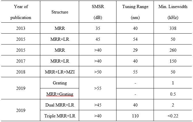 表1. 由UCSB(异质集成激光器国际主要研究机构)制造的异质集成激光器的性能。