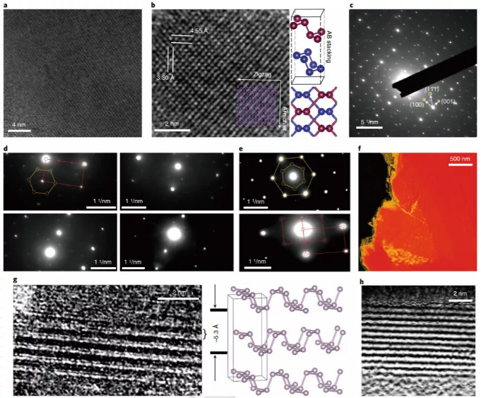 图1. 少层超薄黑磷薄膜的微观结构表征。(a-c) 高分辨率TEM图像,及对应的选区电子衍射(SAED)图像。(d) 样品上不同位置的薄层云母/黑磷切片的SAED图像。(e) 单独的云母晶格和黑磷晶格的SAED图像。(f) 衍射图样过滤微分后的暗场TEM扫面图像。图d-f中,黑磷晶格的衍射及显微结果以红色标记,云母晶格的衍射及显微结果以橙色标记。(g-h) 不同厚度黑磷超薄薄膜的截面TEM图像。