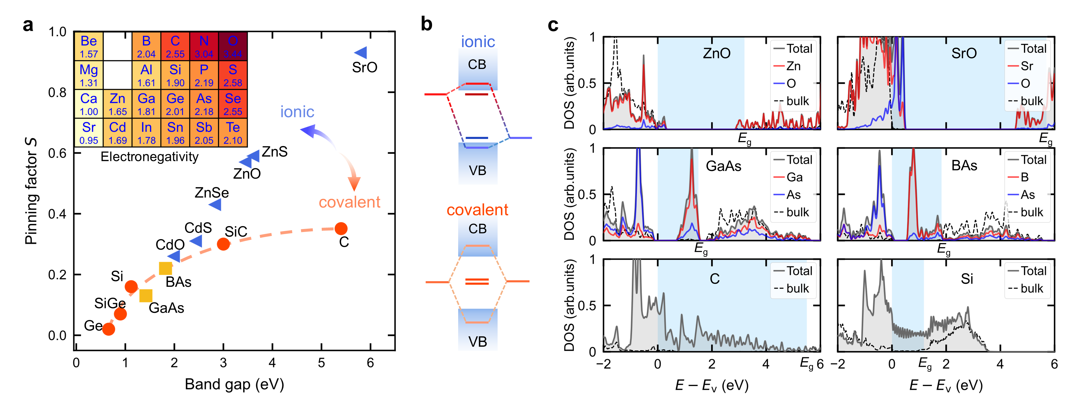 图2:半导体离子性-悬键诱导表面态-费米能级钉扎强度的内在规律。随着离子性增强,带隙深处的悬键诱导表面态密度显著降低,钉扎随之减弱;相反,共价性更强的半导体带隙深处的悬键诱导表面态密度更高,即使带隙宽度相近,也会表现出更强的钉扎。