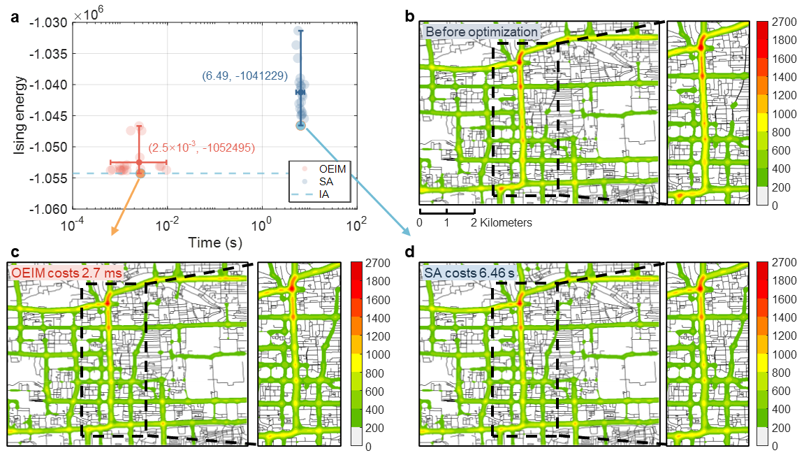 图3 真实交通多方案优化与热力图对比。a,光电伊辛机(红点)与模拟退火算法(蓝点)多次求解的计算时间与伊辛能量对比。b-d,优化前、光电伊辛机优化后(2.7 ms)及模拟退火算法优化后(6.46 s)的交通热力图。