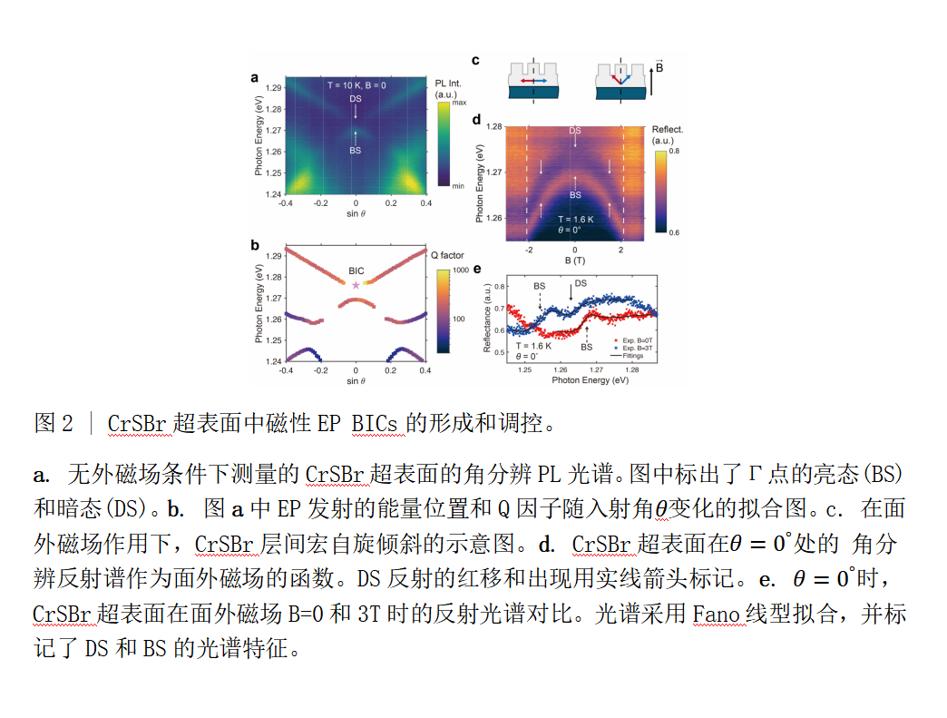 电子自旋可携带非易失的量子信息,是量子信息处理与存储的重要自由度。将自旋态与光子相连接,可实现自旋量子信息的远距离传输与探测,自旋-光子界面因此成为构建可扩展量子网络和连接分离量子节点的关键基础。传统自旋-光子界面的研究主要集中在非磁性半导体量子点、二维过渡金属硫族化合物以及缺陷自旋体系中。尽管磁性材料是当代自旋电子研究和存储行业的支柱,但受限于光学不活跃的带边跃迁、光学性能下降以及有限的自旋弛豫和相干时间,其自旋-光子界面研究相对不足。新近发现的二维磁性半导体(如CrSBr)兼具强光-物质相互作用与磁-电子耦合效应,为这一领域带来了新机遇。此外,磁振子作为磁性材料中独特的集体自旋激发,在CrSBr中已被证明能够与激子态强耦合并在超快时间尺度上调制光学响应。然而,现有研究主要集中在无结构样品和动量积分测量中,磁振子-光子耦合在光子结构中的增强机制及其动量相关物理机制仍有待深入探索。