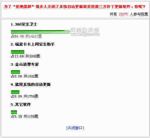 国内著名软件下载站天空软件站前不久举行了一次调查,名为“为了拒绝黑屏很多人关闭了自动更新而采用第三方补丁更新软件,你呢?”,共有22075名网友参与了投票。结果显示:仅8%的用户继续开启“自动更新”,另有64.4%的用户,也就是三分之二的网民选择了使用360安全卫士打补丁。尽管如此,仍有许多网友缺乏安全意识,或因担心被黑屏而没有及时修复系统漏洞,反而使自己成为“抓鸡工具”的牺牲品。