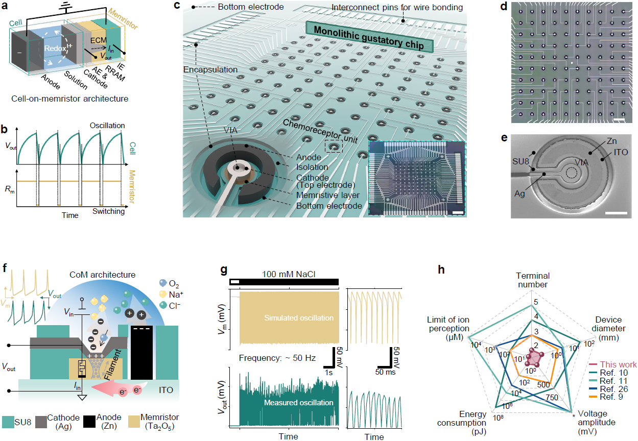基于CMOS兼容制造工艺,实现了CoM器件的晶圆级阵列制备,演示了该领域中首个高密度化学感受器阵列系统。阵列中的单器件可以在盐水溶液的离子刺激下,自发、原位地产生电压振荡信号,其振荡频率与离子浓度直接相关。性能表征测试表明,阵列上的CoM器件表现出包括亚阈值振荡、非周期性簇状放电、全有或无尖峰脉冲以及随机振荡等高阶神经元动力学行为。