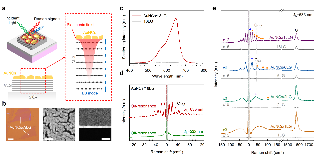 近期,中国科学院半导体研究所谭平恒研究员团队联合厦门大学任斌教授团队报道了等离激元纳腔助力二维材料层间呼吸振动探测方面的重要进展。研究团队提出一种基于金属纳米腔增强层间声子的普适探测新方法,实现了对多层石墨烯和六方氮化硼等二维材料中难以捕捉的层间振动模式的高灵敏度检测。其基本原理在于:材料中振动模式的拉曼信号强度受其极化率及入射电场的共同调控。以多层石墨烯为例,通过在其表面直接沉积纳米尺度的岛状金纳米腔(图1a,b),利用该结构对多层石墨烯极化率的有效调制,以及表面等离激元共振效应,成功实现了对多层石墨烯层间呼吸模式的显著增强。扫描隧道显微镜和透射电子显微镜表征证实,金纳米腔以岛状结构均匀分布于石墨烯表面(图1b)。暗场散射光谱中出现的强共振峰(图1c),以及在633 nm激光激发下显著增强的低频拉曼信号(图1d),均表明所制备的金纳米腔具有良好的等离激元活性,可作为有效的等离激元增强拉曼光谱媒介。实验不仅观测到多层石墨烯中对应面内振动的G峰,还发现了一系列随层数变化的新低频模式。这些模式的频率远高于已知层间剪切模的最高频率,证实其来源于多层石墨烯的层间呼吸振动(图1e)。研究还首次发现等离激元可调制振动模式的偏振特性,突破了传统拉曼选择定则的限制。